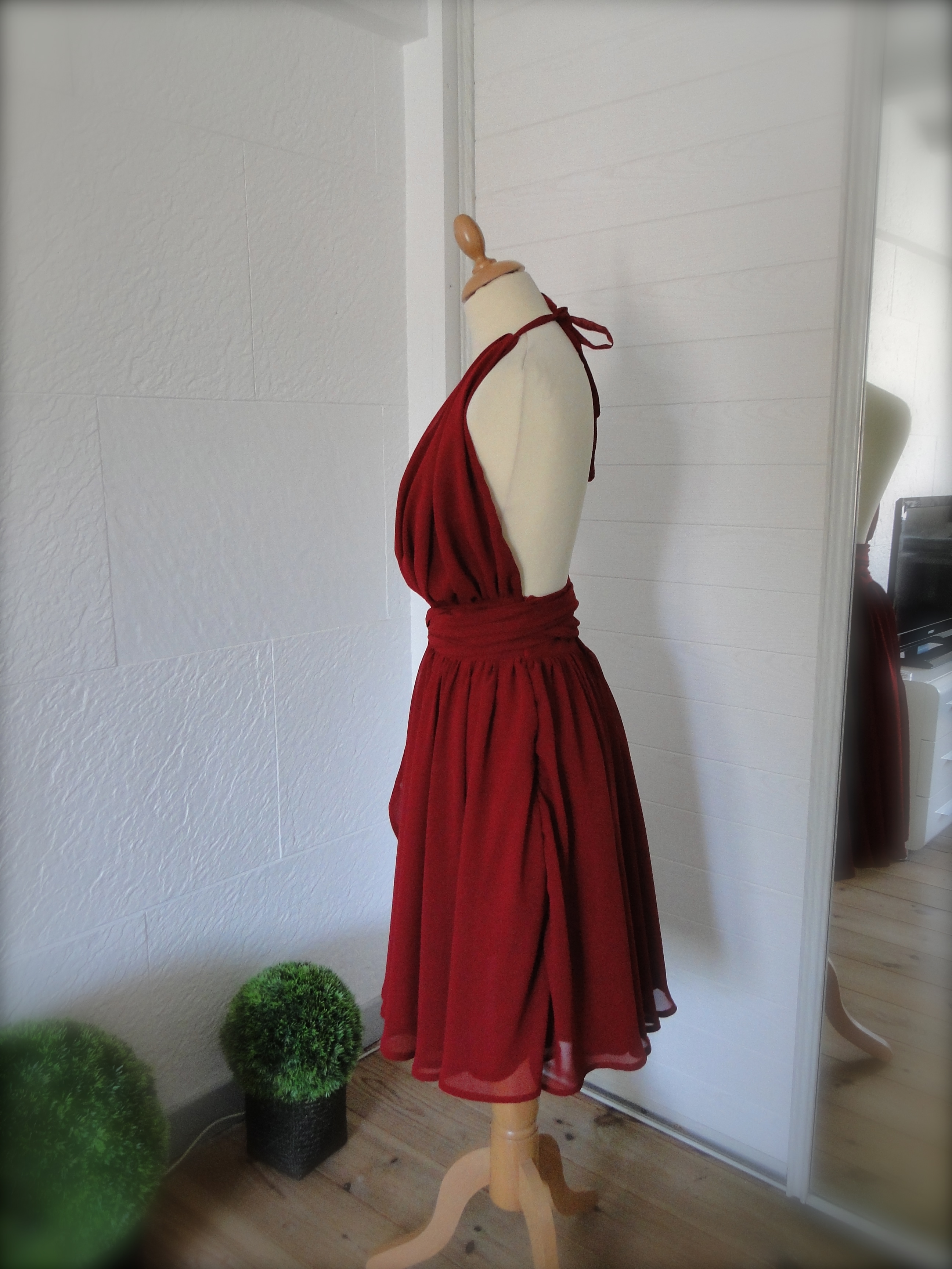 Le modèle de départ est la robe 136 du Burda de juin 2012, le tissu préconisé est plissé mais Marie-Ange a choisi (sur photos) un beau voile rouge sang de boeuf.