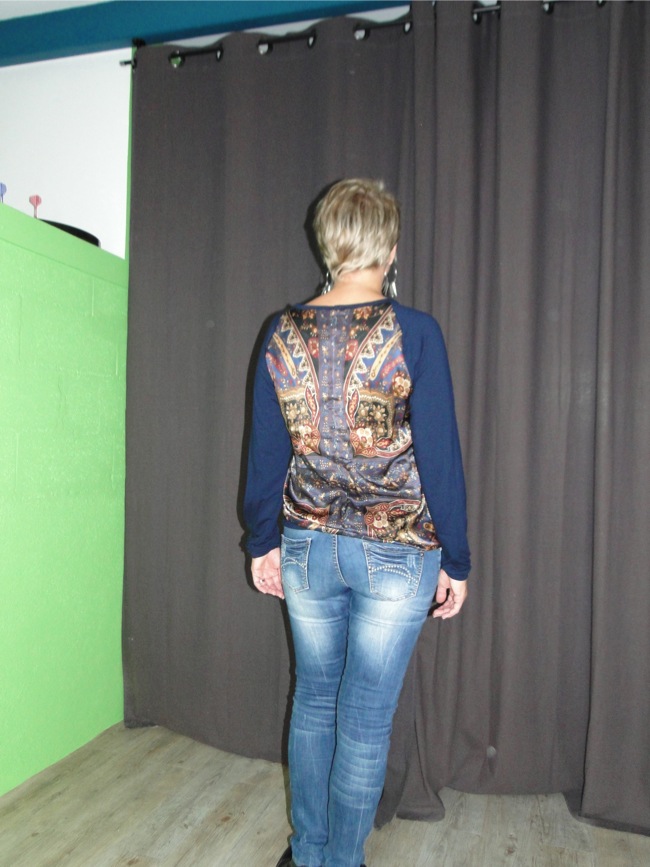 Deuxième version, manches en jersey bleu et corps en synthétique soyeux à motifs cachemire